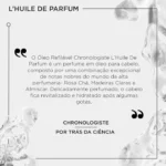 O Kit Kérastase Chronologiste com refil para todos os tipos de cabelo é infundido com extrato de Mirra, que visa nutrir os fios. Kérastase Chronologiste L’Huile de Parfum é um óleo capilar perfumado composto por uma combinação excepcional de notas nobres do mundo da alta perfumaria: Rosa Chá, Madeiras Claras e Almíscar. Delicadamente perfumados, os cabelos ficam revitalizados, hidratados e espessos após algumas gotas.